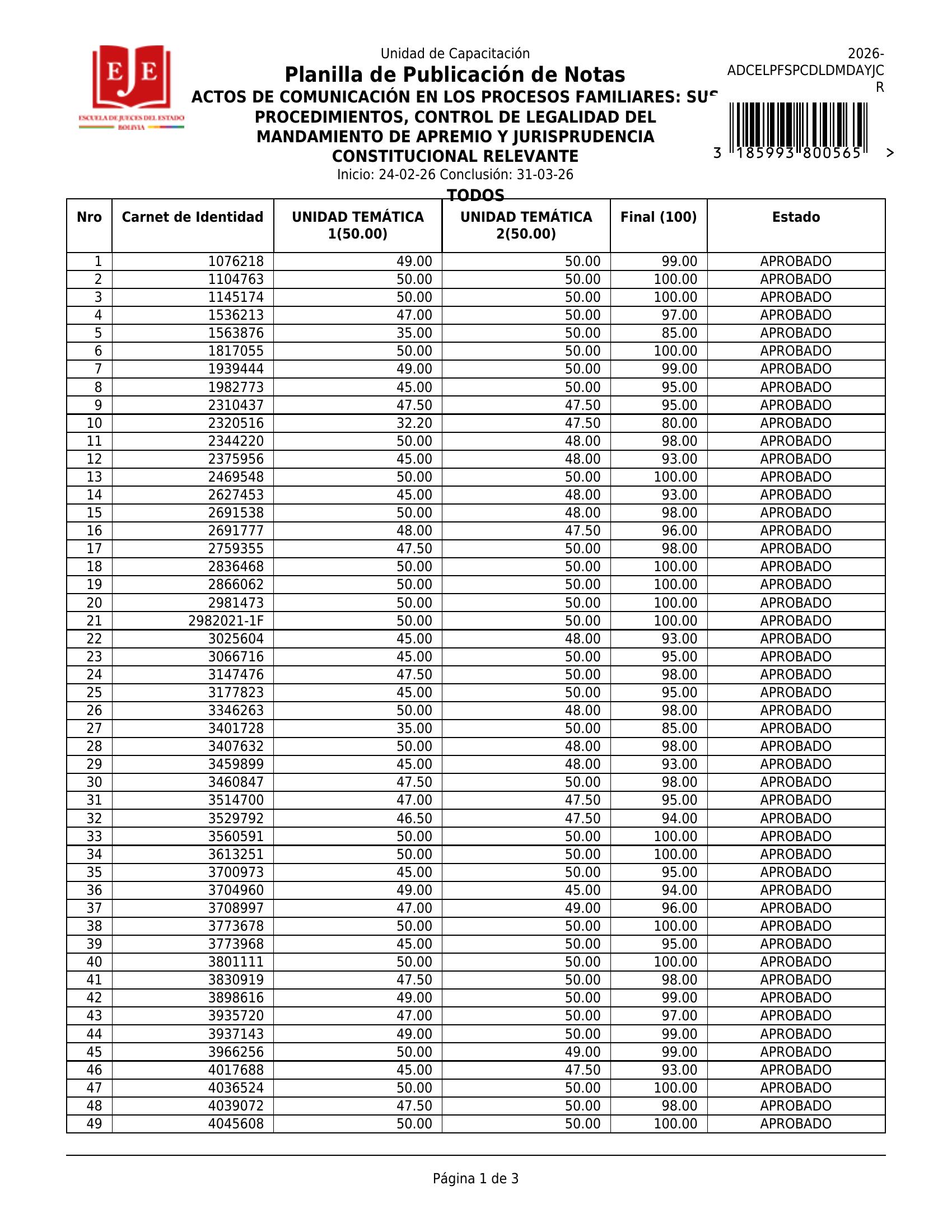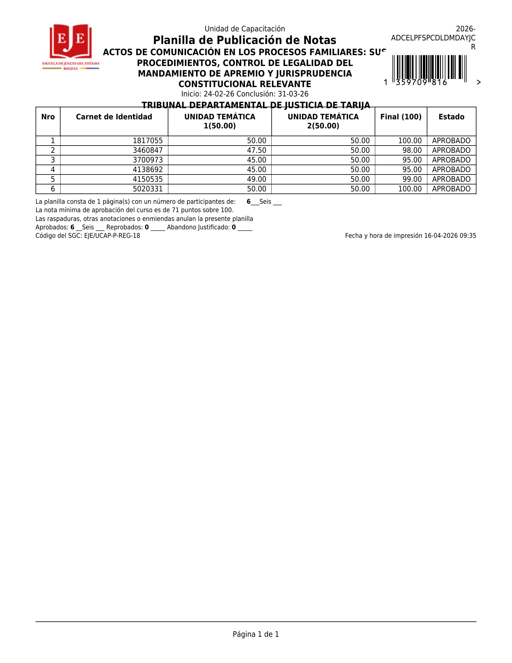 En estricto cumplimiento de las disposiciones académicas, establecidas en los artículos 41 y 42 del Reglamento Específico de la Unidad de Capacitación, se publica la planilla de calificación de la actividad denominada: